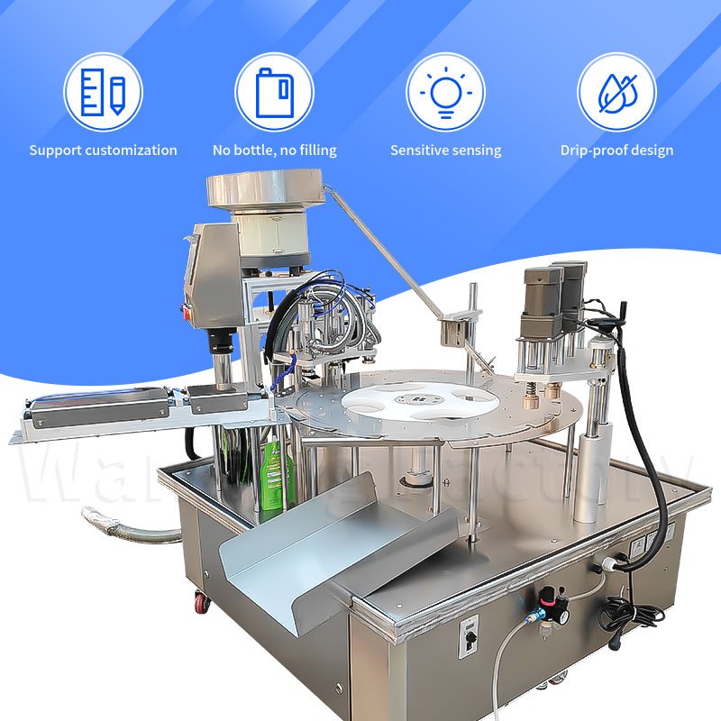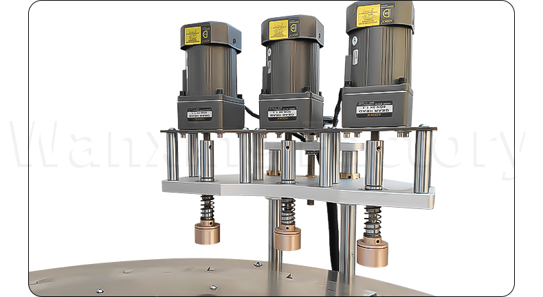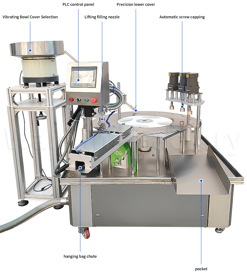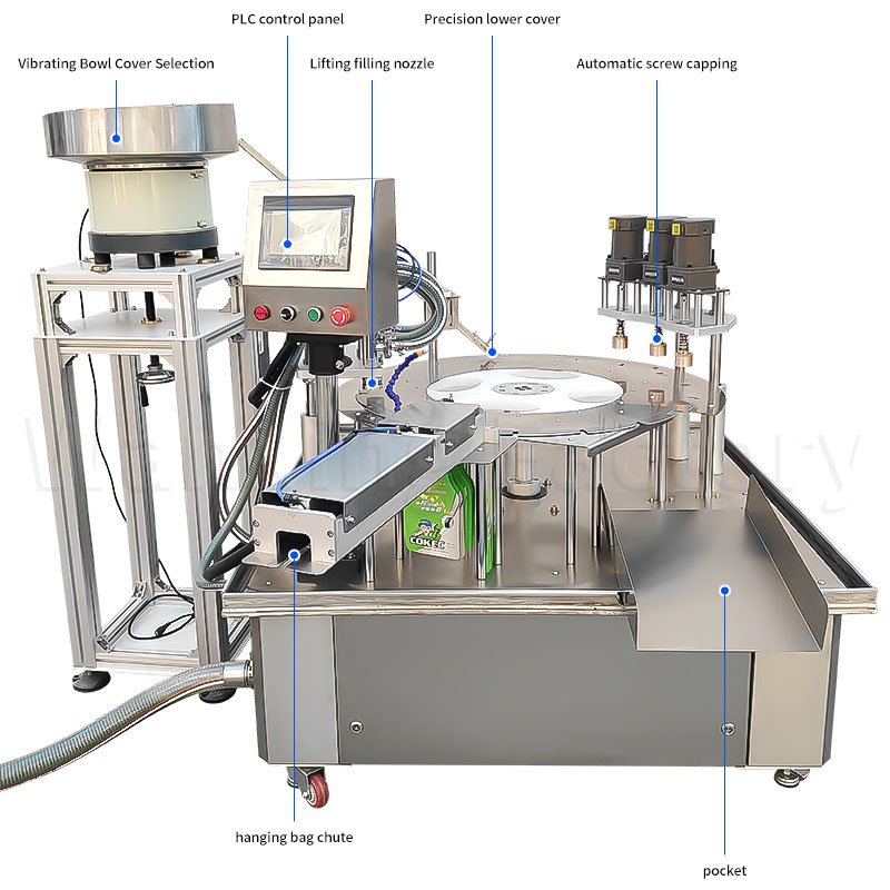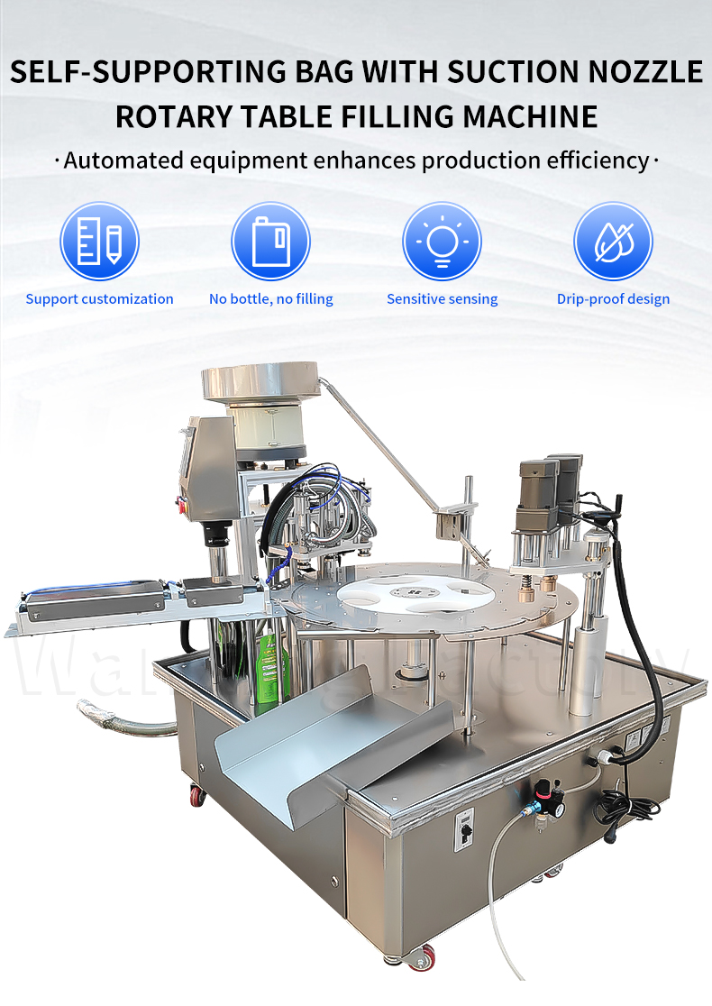 The self-replenishing and self-supporting bag rotary table three-head filling and cap screwing machine adopts a rotary table linkage structure, with three heads operating simultaneously, automatically completing quantitative filling, precise cap placement, and secure cap screwing. The process is coherent and efficient, with tight and reliable sealing, suitable for the automated production needs of self-supporting bags.